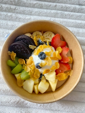 กรีกโยเกิร์ตไซต์เล็ก 1 Scoop + ผลไม้ 3 อย่าง (เลือกเองได้) + น้ำผึ้ง + คอร์นเฟลก